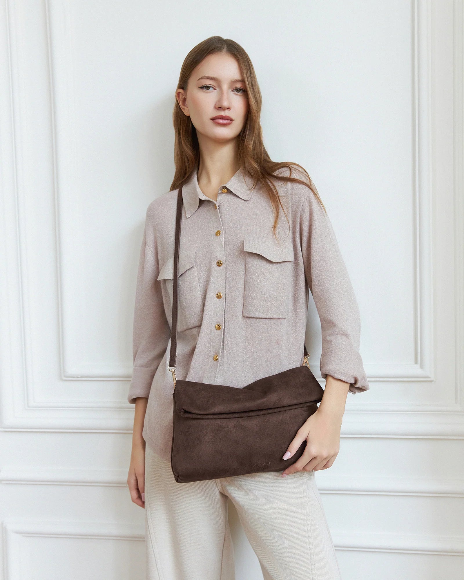 The Luka Chocolate Suedette Clutch brings effortless versatility to every escape. Crafted from soft faux suede in a minimalist fold-over silhouette, she offers just enough structure to keep your essentials close and your style considered. A discreet blind magnet closure opens with ease, revealing internal zip and slip pockets designed to keep your must-haves neatly organised. Tucked beneath the front flap, a hidden zip pocket provides quick access for life on the go. Finished with an adjustable, detachable crossbody strap, Luka Chocolate Suedette transitions effortlessly into a fold over clutch with crossbody strap for hands-free exploring and elevated evening moments alike. The perfect plus-one for winery days, slow mornings, and girls’ nights out.