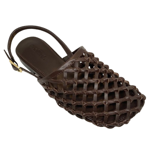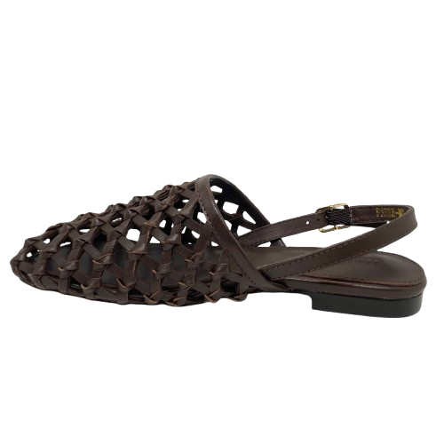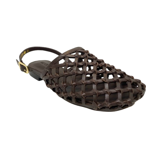 This quirky little flattie could be described as a "mule with a back strap". It has an asymmetrical shaped toe which is covered by knotted, open weave, chocolate coloured leather. Brand is Mollini.
