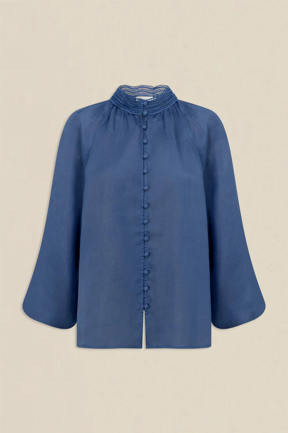 - high neckstand in lace fabric adds softness and femininity
