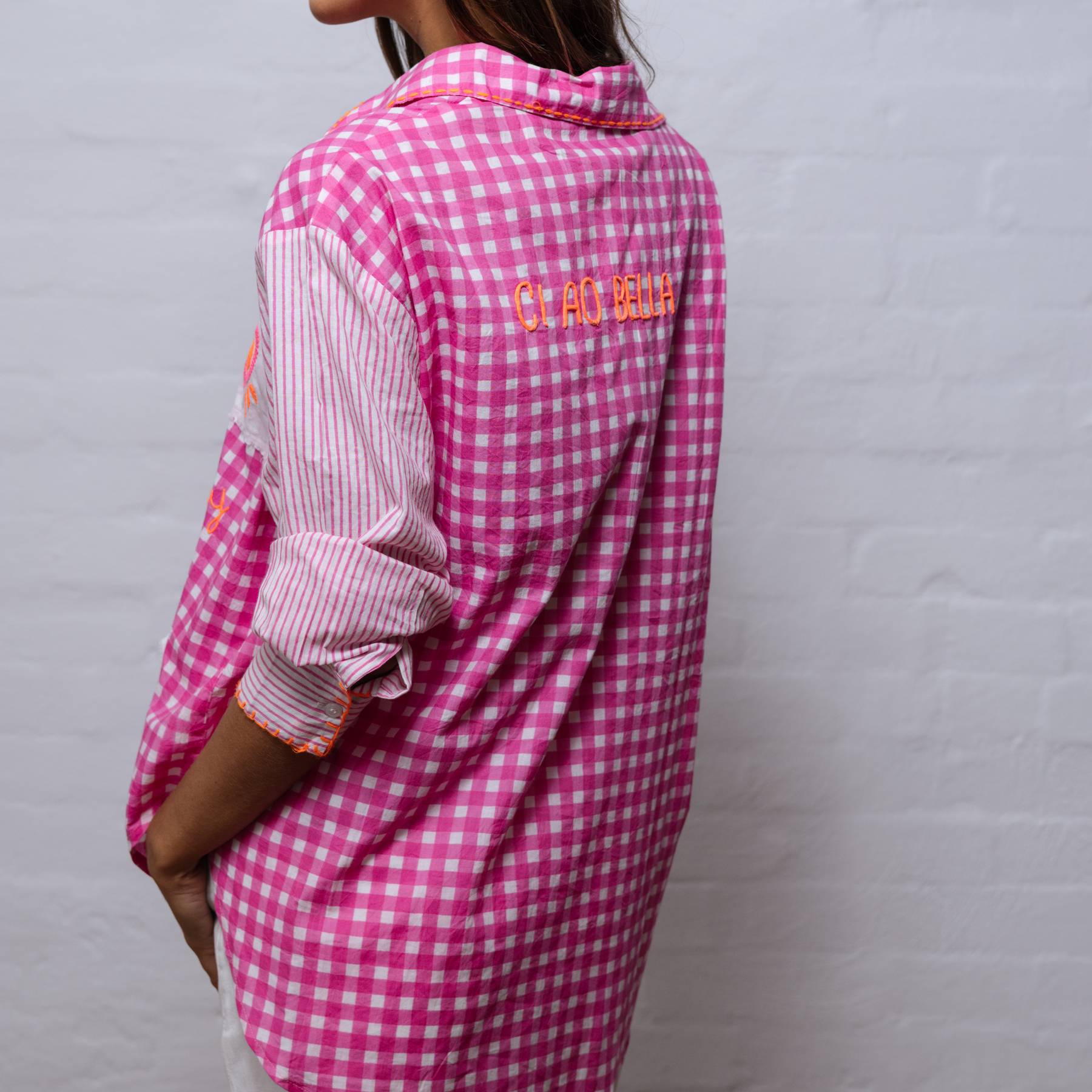 This soft cotton shirt offers sun protection and coolness in our hot summer months. A fun mix of stripes, checks, fluoro embroidery and blanket stitch features. The word "CIAOBELLA" is embroidered across the back.