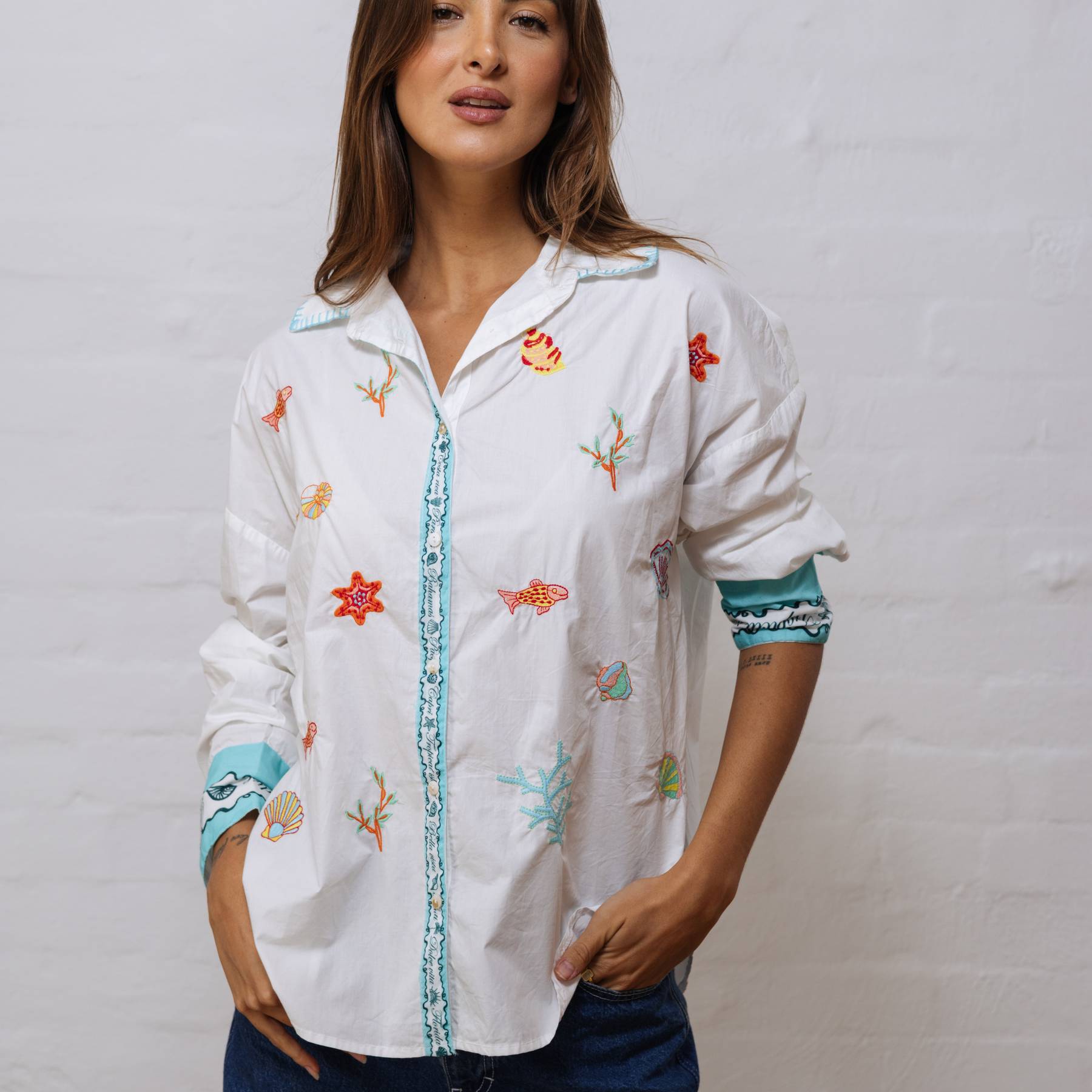 A fun white 100% cotton shirt with aqua printed cuffs and front panel, aqua blanket stitching at the collar and embroidered sea life motifs on the front.