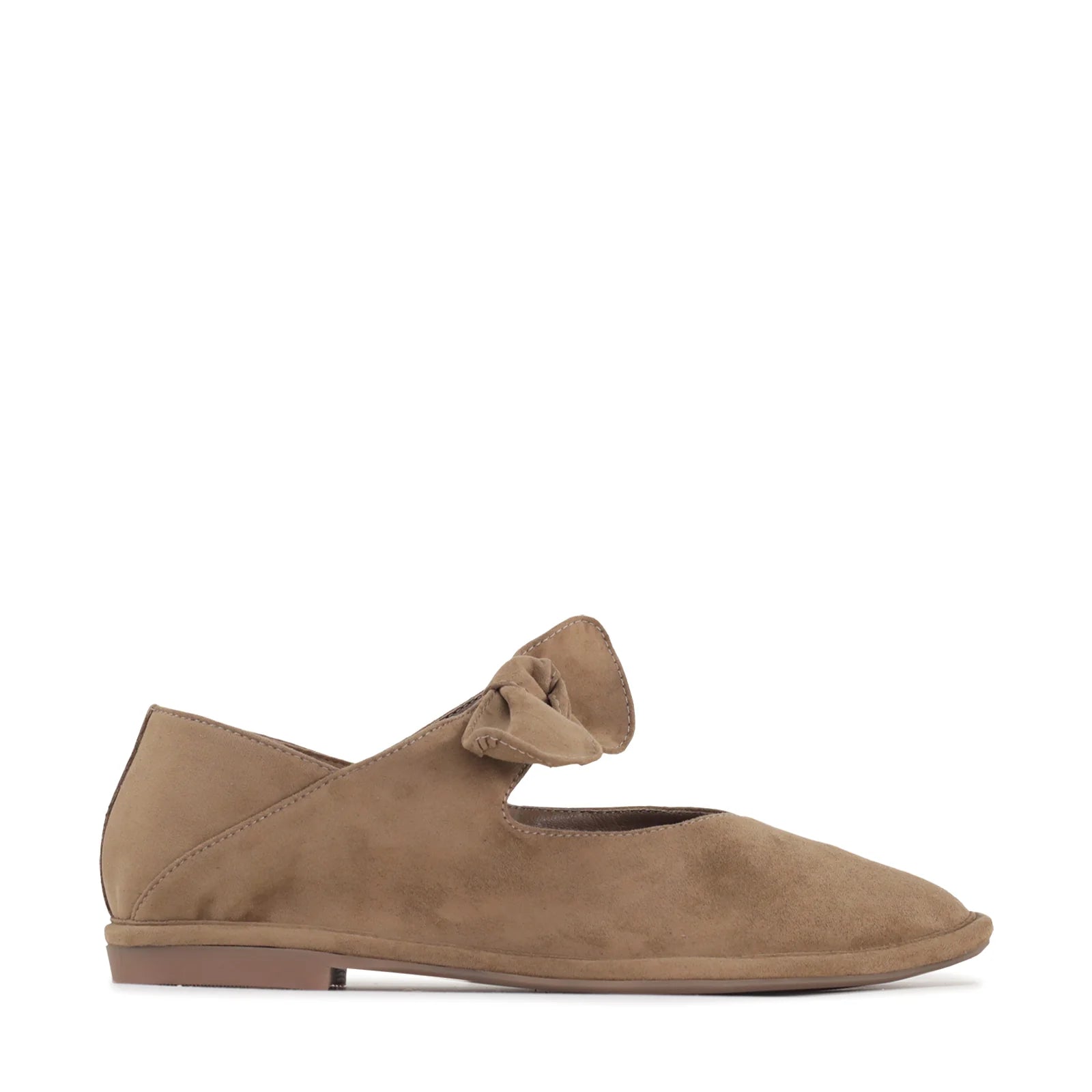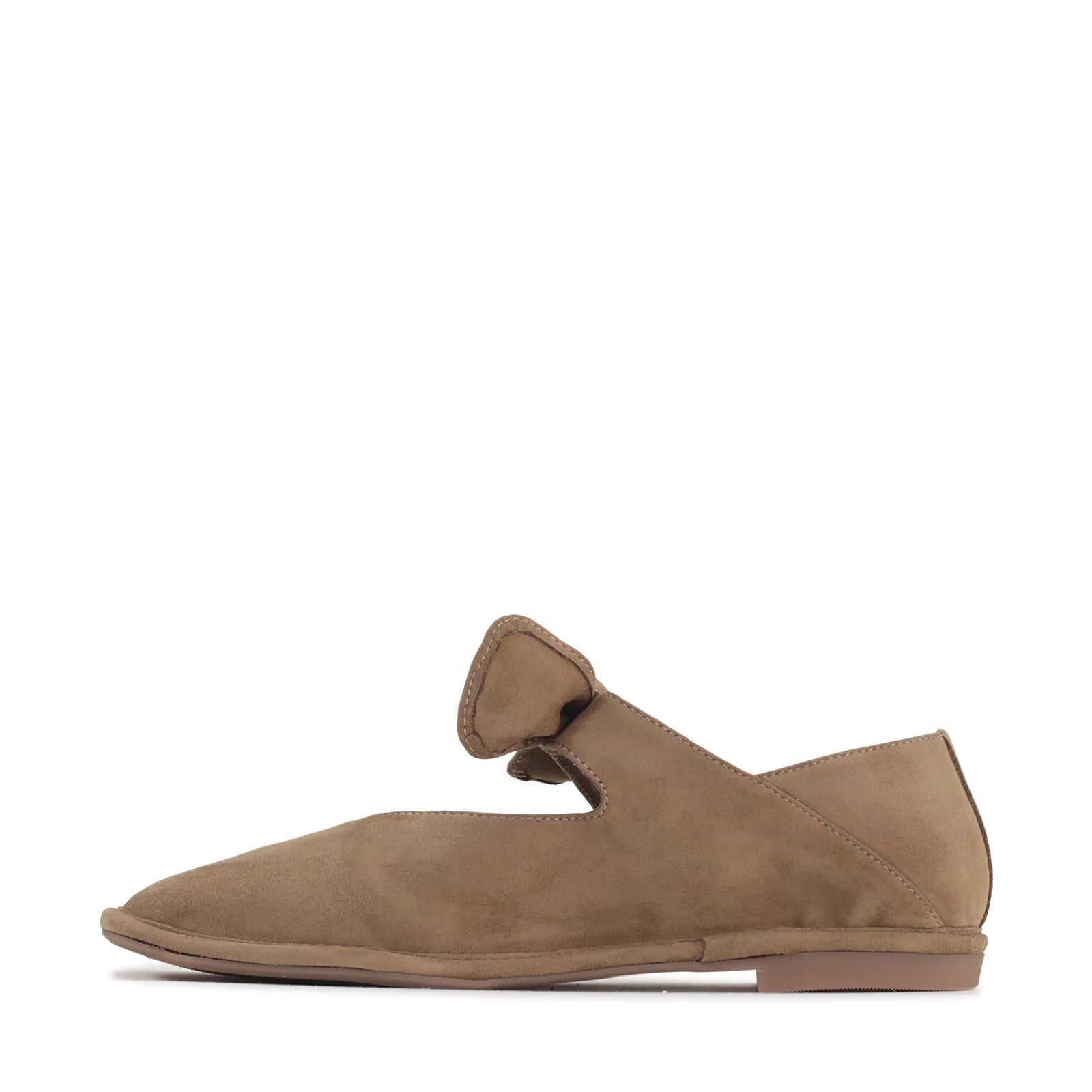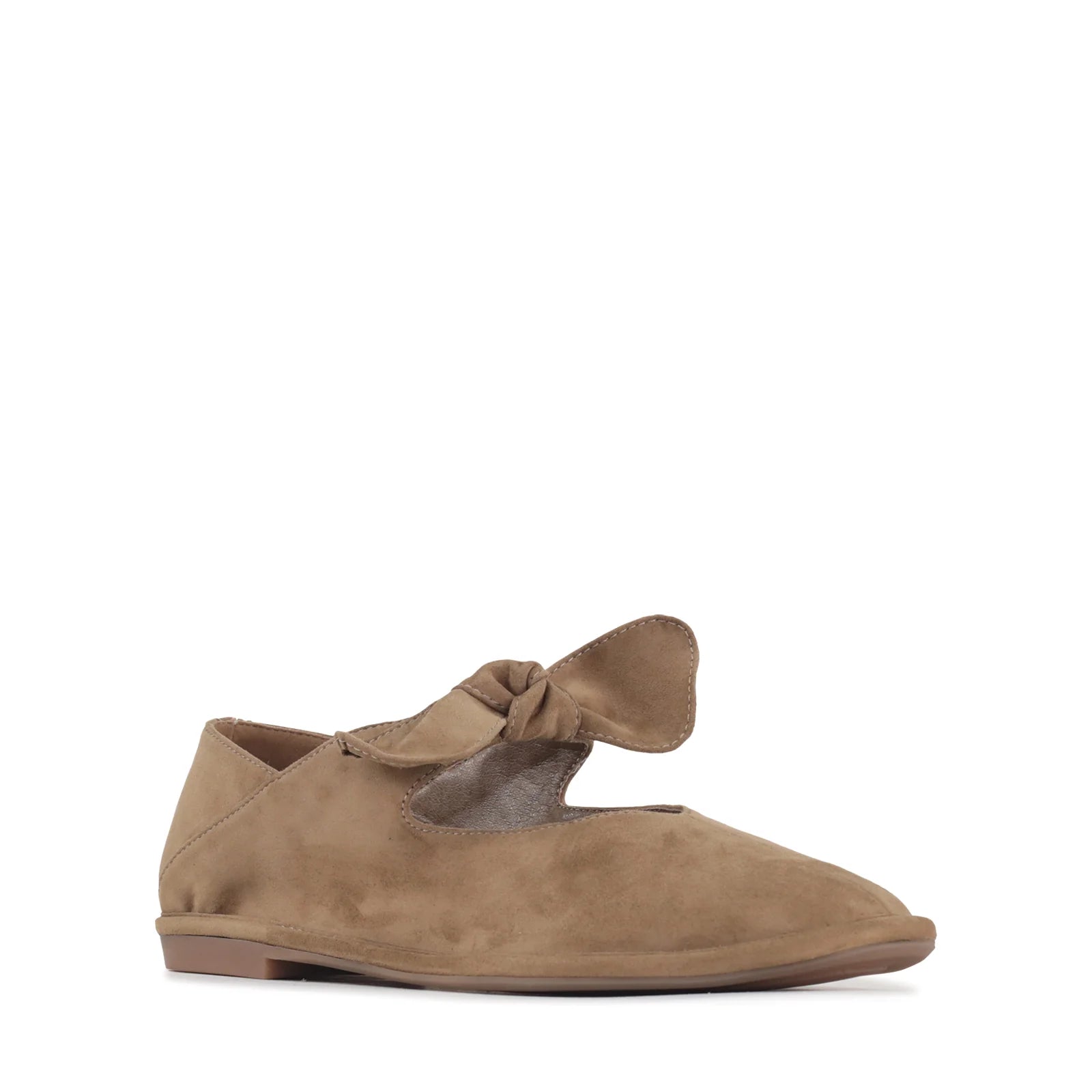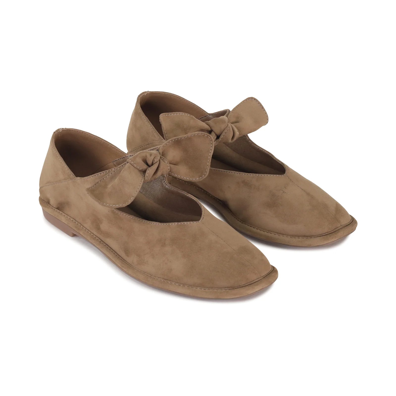 Suedette fabric in this little flattie gives it softness while the cute bow gives it the Mary Jane look of cuteness. Elastic under the bow means ease of entry.